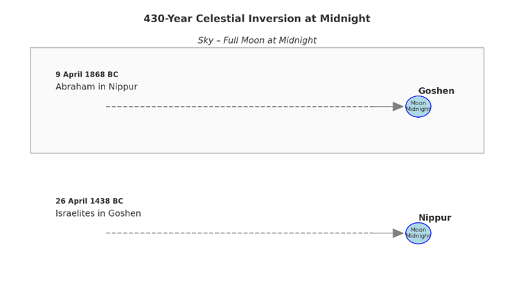 At the first, the full moon reached its midnight culmination directly above Goshen, foretelling the land Abraham’s descendants would one day inhabit. At the second, on the night of the Exodus, the full moon culminated above Nippur—the place where the covenant began. The geometry of the heavens had inverted, creating a celestial mirror between promise and fulfillment.